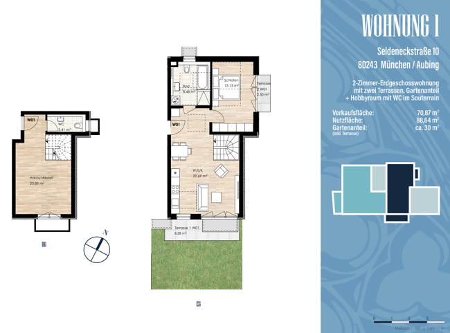 Gartenwohnung mit Südterrasse und 1 Hobbyraum mit Gäste-WC im UG