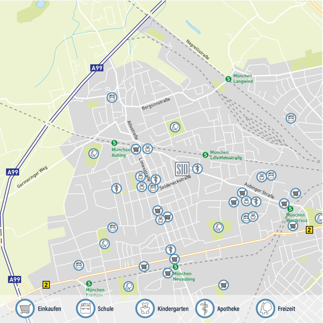 München / Aubing Die Lage in der Seldeneckstraße bietet alles, was urbanes Leben in München ausmacht. Eingebettet in eine gutbürgerliche Nachbarschaft sind Einkaufsmöglichkeiten, Schulen und Kindergärten auch fußläufig in wenigen Minuten erreichbar. Die nahegelegenen S-Bahn-Station Leienfelsstraße bildet die perfekte Anbindung an die Münchner Infrastruktur. In ca. 20 Minuten erreicht man den Hauptbahnhof München. Die nur 1,3 km entfernte Bundesstraße B2 führt über den Bahnhof Pasing direkt ins Stadtzentrum und ist an die A99 angeschlossen.