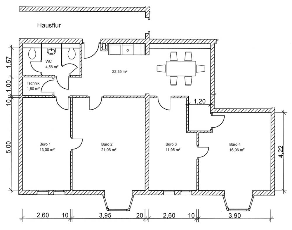 Die Bürofläche verteilt sich auf vier getrennte Büroräume, die Platz für produktives und ruhiges Arbeiten bieten. Ergänzt wird das Raumkonzept durch einen praktischen Abstellraum und einen WC-Bereich mit 2 Kabinen, sowie einen großzügigen Eingangsbereich mit moderner Küchenzeile.