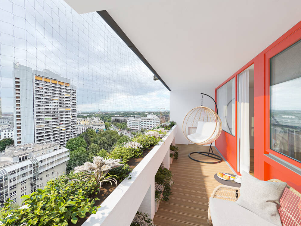 Dieses ca. 35,55 m² große Apartment überzeugt durch seine ruhige Lage und durchdachte Raumaufteilung. Der geräumige Wohn- und Schlafbereich hat eine große Fensterfront, die viel Tageslicht hereinlässt und für eine angenehme Wohnatmosphäre sorgt. Die separate Küche und die Diele sind ebenfalls mit Fenstern ausgestattet. Ergänzt wird das Apartment durch eine ca. 11 m² große Ostloggia, ideal für den morgendlichen Kaffee oder entspannte Abende im Freien mit einem Blick auf die Skyline von München.