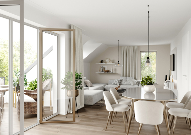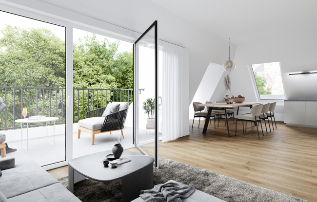 Die Dachgeschosswohnung besticht durch eine durchdachte Architektur, hochwertige Ausstattung und nachhaltige Energieversorgung mittels einer effizienten Luft-Wärmepumpe.
