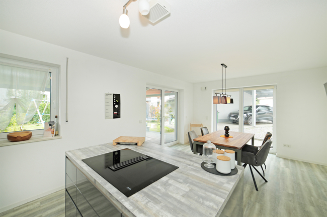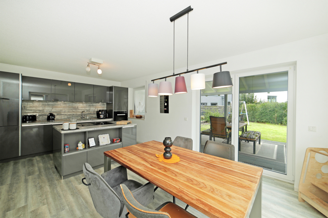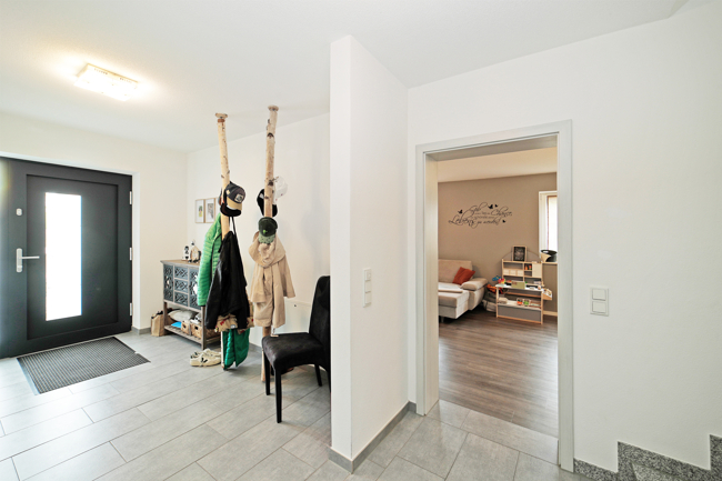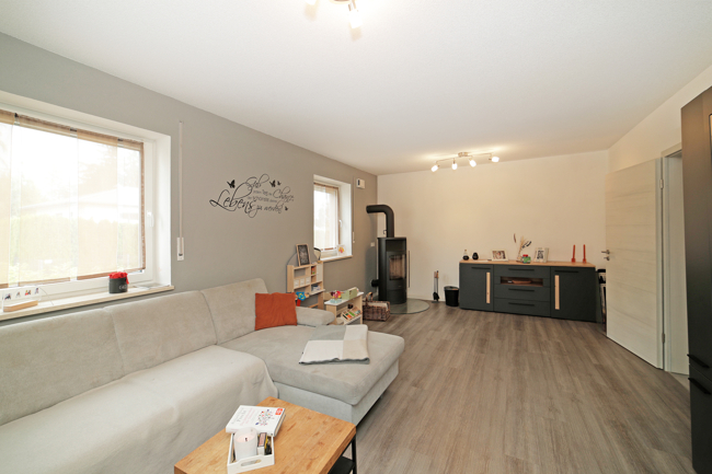Bereits beim Betreten des Hauses empfängt Sie ein freundlicher Eingangsbereich mit hellen Bodenfliesen sowie einer praktischen Garderobe und Gäste-WC. Im Erdgeschoss finden Sie dann das gemütliche Wohnzimmer mit Holzkamin sowie die helle Küche mit Essbereich und direktem Zugang zur überdachten Terrasse.
