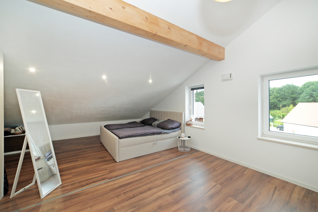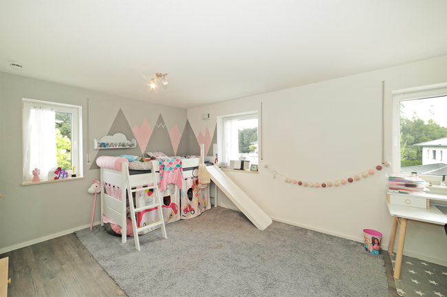 Im Obergeschoss erwarten Sie zwei helle, großzügige geschnittene Zimmer sowie das Tageslichtbad mit großer Walk-In Dusche und Badewanne.