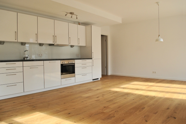 E & Co. - Loftige und exklusive 2-Zimmer EG-Wohnung mit hochwertiger Einbauküche und Süd-Terrasse.