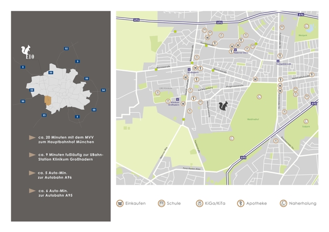 Großhadern, und insbesondere das Blumenviertel, gehört zu den gehobenen und begehrtesten Wohngebieten im Münchner Südwesten. Insbesondere das Uni-Klinikum und das Max-Plank-Institut haben in den letzten Jahren zu einem steigenden Bedarf nach Wohnraum in gehobener und bester Ausstattung geführt. Die schöne Lage nahe dem Waldfriedhof bietet ein ausgesprochen gepflegtes, grünes und sozial gesundes Wohnumfeld und ist vorwiegend von Einfamilienhäusern und Doppelhäusern geprägt. Die attraktive Mischung aus Grünflächen, hervorragender Infrastruktur mit zahlreichen Einkaufsmöglichkeiten, sehr guter öffentlicher Verkehrsanbindung und vielen Arbeitgebern machen Großhadern lebens- und liebenswert. Sowohl die Garmischer (A95) als auch die Lindauer (A96) Autobahn sind in wenigen Minuten erreichbar. Die fußläufig entfernte U-Bahnhaltestelle Großhadern (U6) sorgt für eine ideale Anbindung an die Münchner Innenstadt. Für Familien mit Kindern gibt es eine Vielzahl an Betreuungs- und Bildungseinrichtungen mit unterschiedlichen pädagogischen Konzepten. Der Waldorfkindergarten und das Privatgymnasium liegen fußläufig von Ihrem neuen Zuhause. Städtische und staatliche Schulen sind ebenfalls gut erreichbar. Der nahe gelegene Forstenrieder Park mit seinen ausgedehnten Wanderwegen, die Kulturlandschaft Fünfseenland und die Alpenregion bieten einen hohen Freizeitwert.