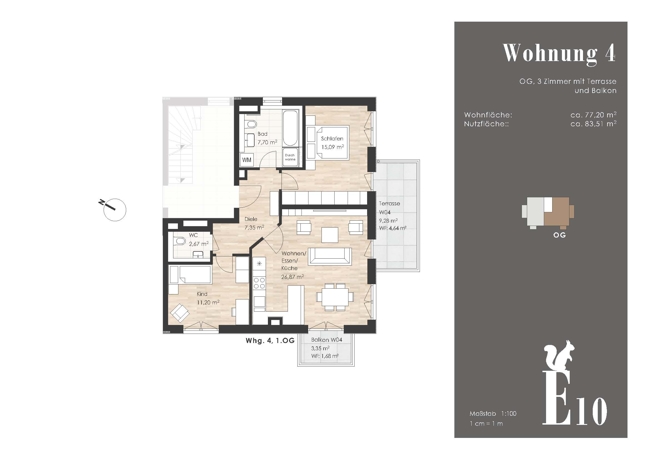3 Zimmer, OG, 77,20 m² Wohnfläche + Terrasse und Balkon